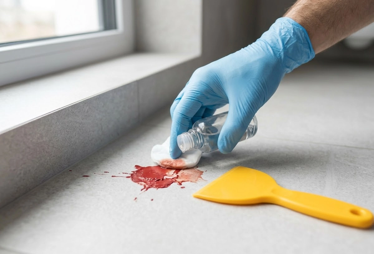 Остатки строительных материалов — засохшие капли клея, монтажной пены, краски, шпаклевки. Они требуют специальных растворителей и аккуратного механического удаления, чтобы не повредить чистовую отделку.